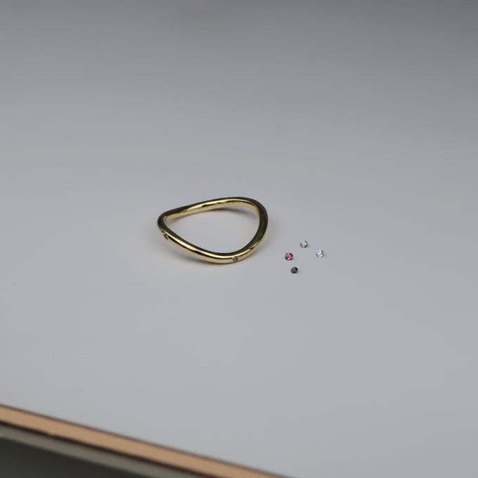 The Frances ring is a fine ring that curves at the front and sides and measures 2mm around the band. This design is offered in solid 9, 14 or 18ct recycled yellow gold. This ring can be personalised with various stone combinations and the available options are listed for your selection. The stones that are listed are hard wearing and are suitable to be placed as designed around the four dips and peaks of this style.
